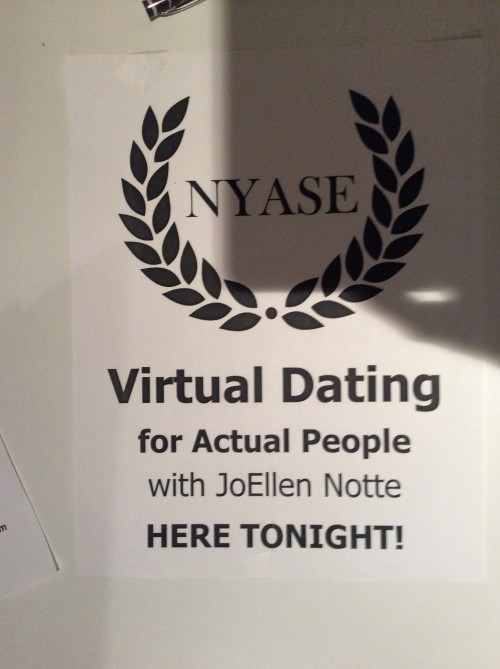 Flyer reading "NYASE: Virtual dating for actual people with JoEllen Notte HERE TONIGHT!"