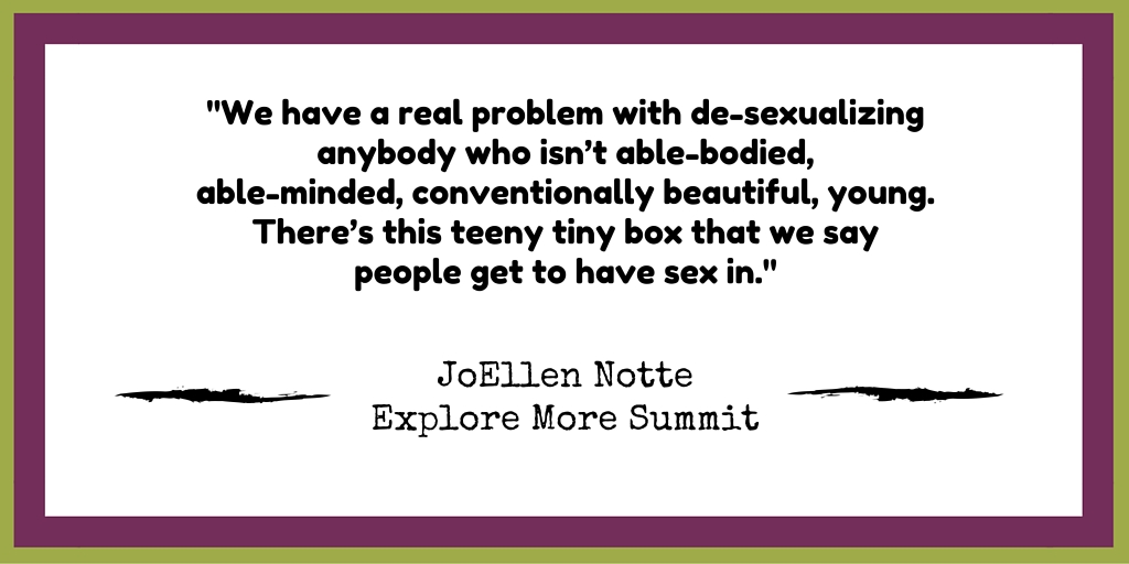 Graphic reading "We have a real problem with de-sexualizing anyone who isn't able-bodied, able-minded, conventionally beautiful, and young. there's a teeny, tiny box that we say people get to have sex in. JoEllen Notte, Explore More Summit"
