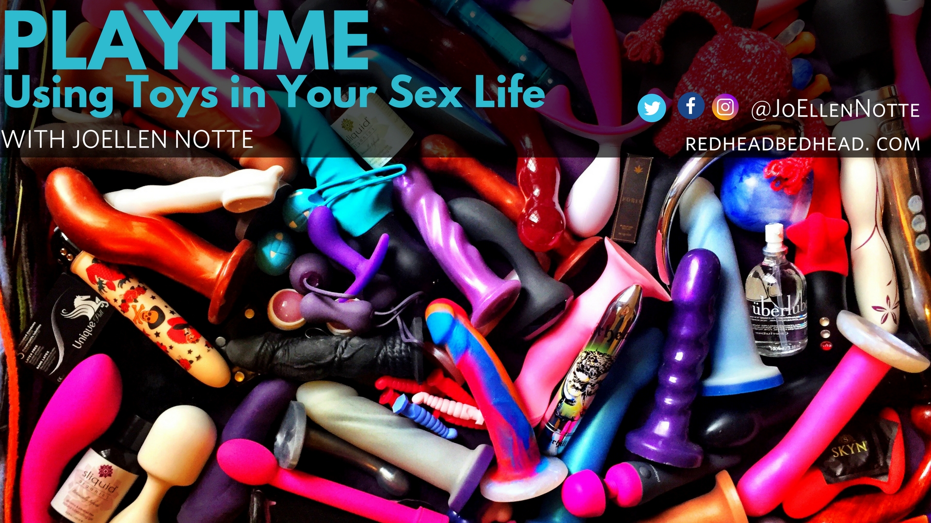 Graphic reading "Playtime: Using Sex Toys in Your Sex Life with JoEllen Notte" above a photo of many sex toys