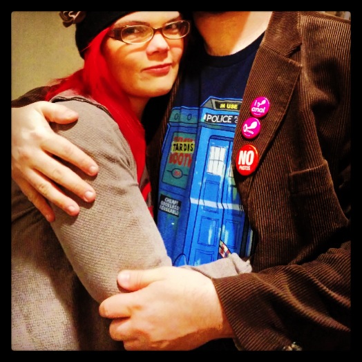 JoEllen hugging a tall man in a Dr. Who t-shirt, the man's face is not visible