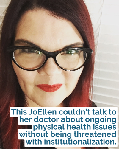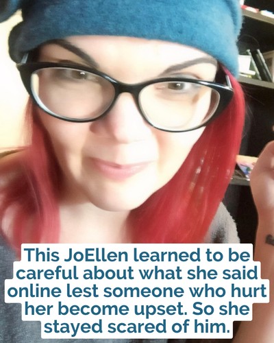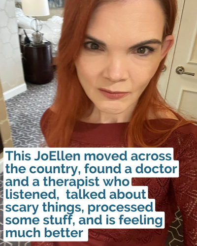So, am I saying that we should all be prepared to have everyone dump all their trauma on us at all times or else we’re hurting them? No, emotional dumping is not great for the person who has experienced the trauma and is awful for the folks around them. But, there’s a distinct difference between expressing that you cannot (or don’t wish to be) the person traumatic things are discussed with and demanding that someone never discuss their trauma. What I am saying is that it we need to be aware of the degree to which we ask people to shove down their emotional stuff for our comfort. So for example, the boss I mentioned above could have said something like “JoEllen, I know you are dealing with some mental health stuff but I would appreciate it if you didn’t discuss it at work” instead of “you are only depressed because you are choosing to be depressed”. One makes me feel seen while stating a boundary, the other puts me on notice that any mental/emotional pain is my own fault and it’s better to just, you know, not have it. We can support people and not do the harmful silencing even if we cannot be the one they can talk to.
