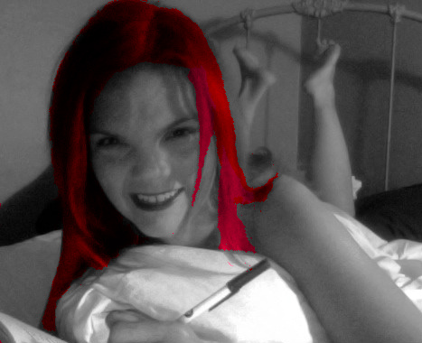 Woman on her stomach on a bed writing in a notebook, her feet and the wrought-iron headboard visible in the background. The photo is black and white but her hair is bright red.